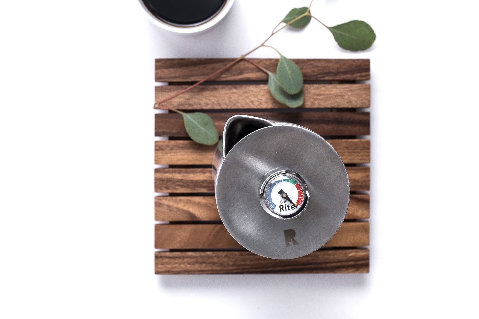Burnt coffee is bad, having to read tiny numbers before you’ve had your first cup...also bad. Our custom designed and manufactured thermometer makes brewing simple. When it hits green, you are ready to brew. The Rite thermometer lives in the shaft of the filter so it’s easy to use and is always on-hand.